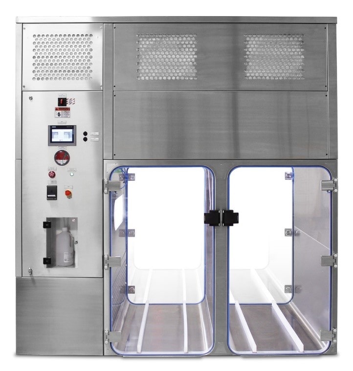 The injected H2O2 will be released to the isolator’s exhaust system. The control system will activate the fan blowers to exhaust the air outside and to intake fresh air to the chambers. Vaporized H2O2 sensing will start after an adjustable time delay to ensure that the chamber has a residual H2O2 concentration of less than 1.0 ppm.