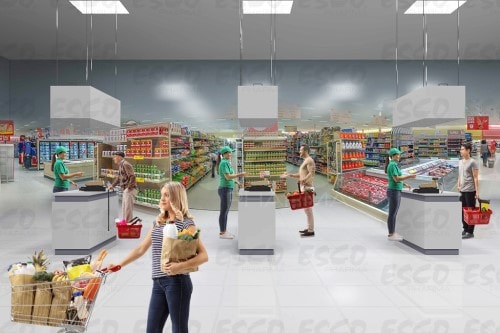 Figure 3. FFU placed over the grocery counter. Installed either by attaching it on the ceiling (left) or by directly integrating it with the countertop (right).