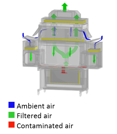 Unidirectional Airflow provides the work zone with a continuous supply of filtered air. This mass airflow effect serves to sweep contaminants past and away from the preparation and out of the isolator environment. (CETA, 2005) |