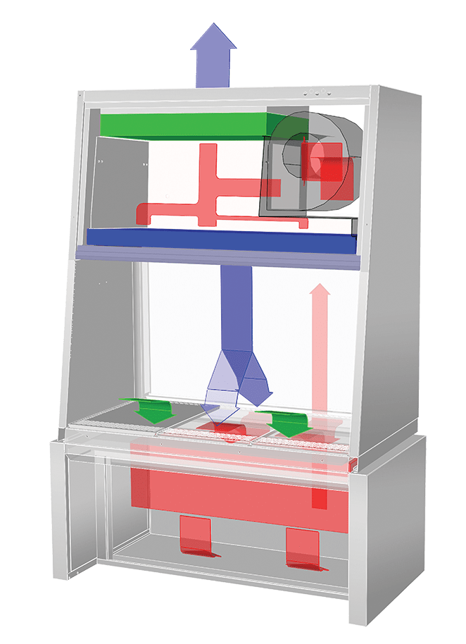 Air enters the cabinet through perforations located in front of the work zone before mixing with used downflow air in a common chamber below the work zone (this air does not mix with the filtered downflow air in the cabinet’s main chamber). This mixed air then passes through the HEPA filter located beneath the work zone.